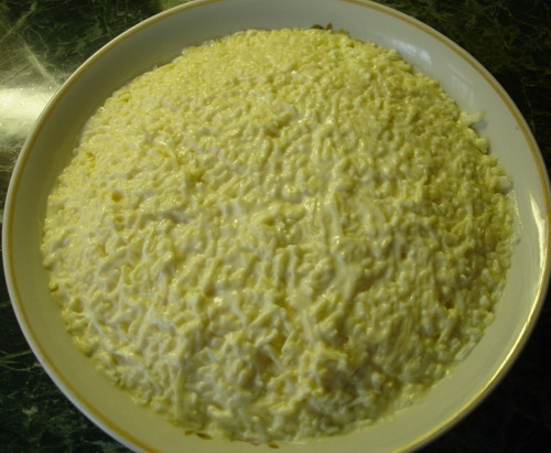 Луковицу порезать полукольцами и выдержать в маринаде: 1 стакан воды, 1 ст. ложка 9%-ного уксуса.